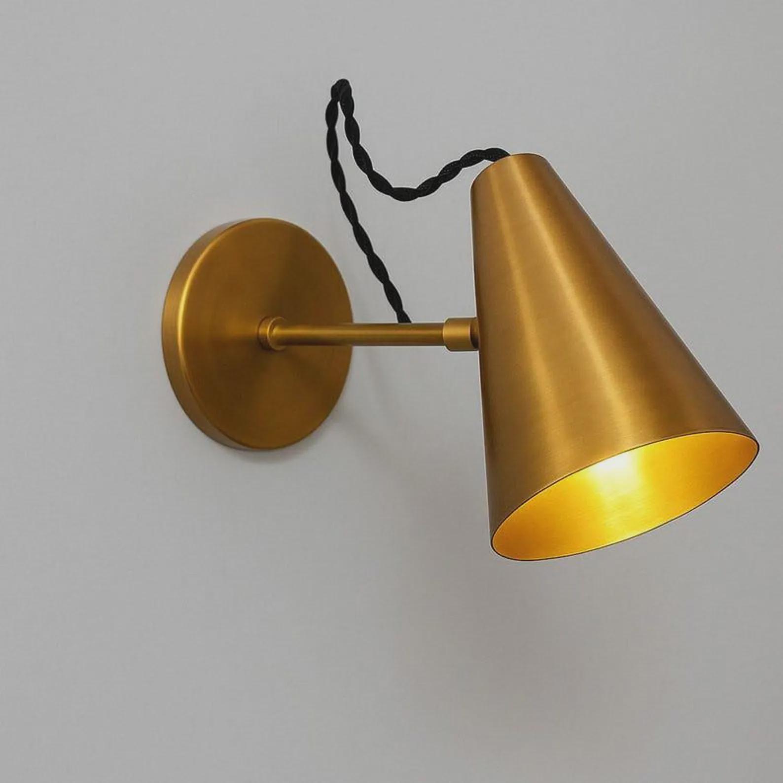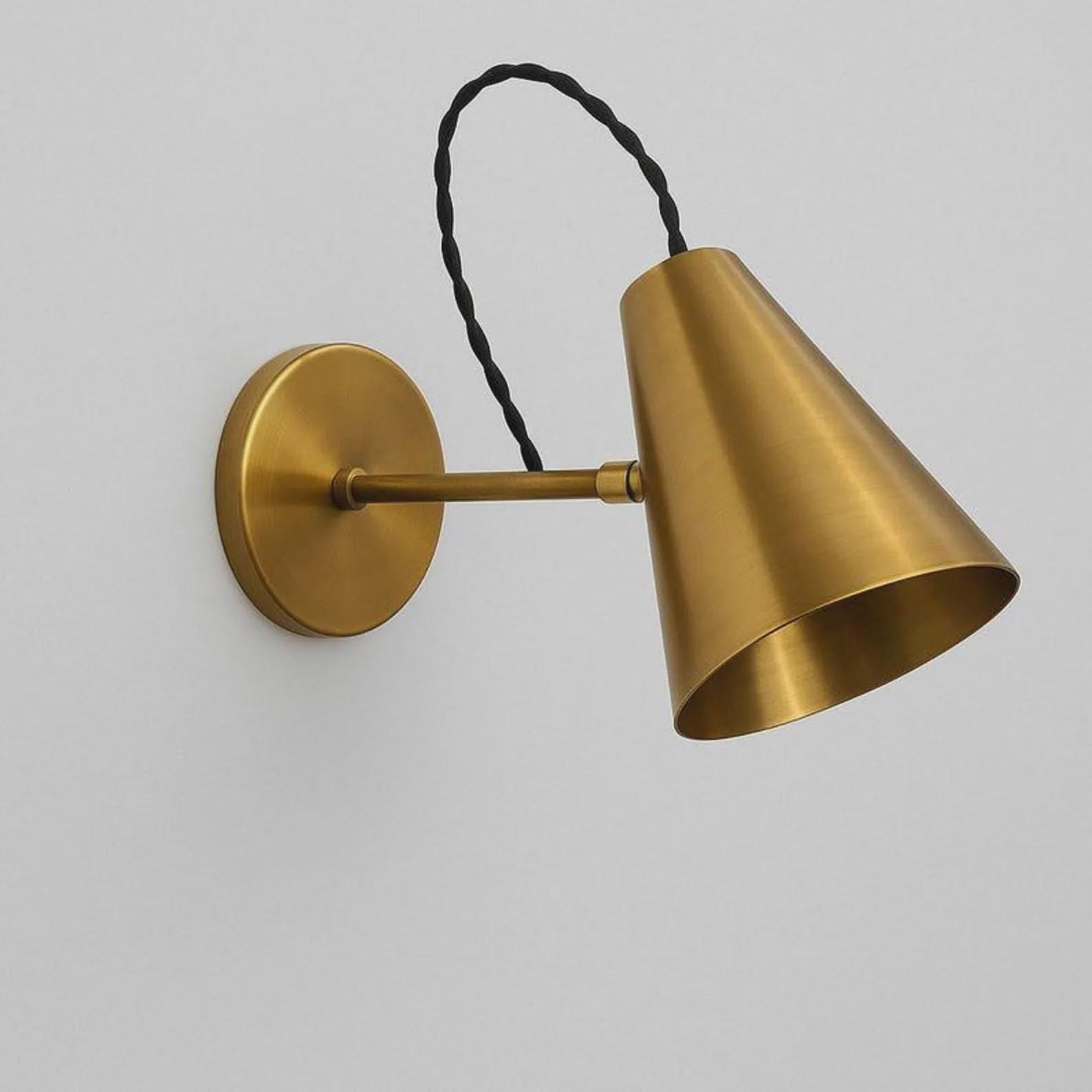 Add a modern feel to a room with this shades wall sconce. This stunning piece features a brass & metal material cone white shade with 2 lights giving ambiance light and shades for the direct light. Ideal over a kitchen counter. The brass shades can be also made in different finishes. Please choose Finish from the image attached.