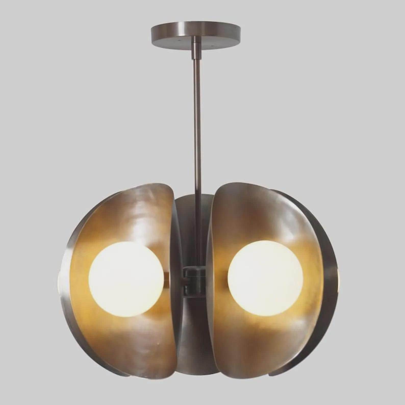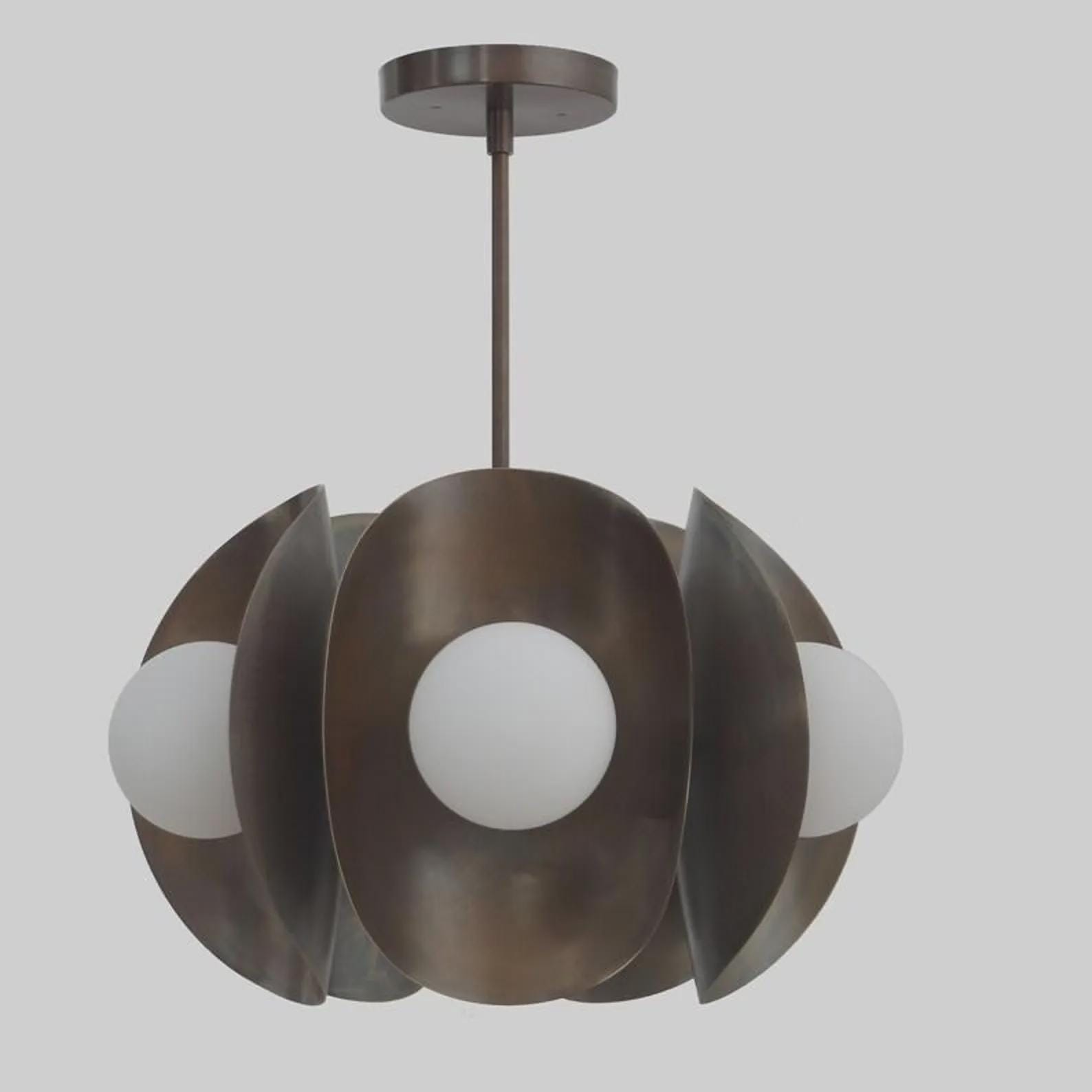 Fixture Size: 20"W x 20"D X 10"H Itself Drop Rods : Custom size drop rods available to adjust the total height. Canopy Size: 5" Dia Round Glass Shades : 5 x 5" matte white glass globes included Material: Brass & Glass Globes