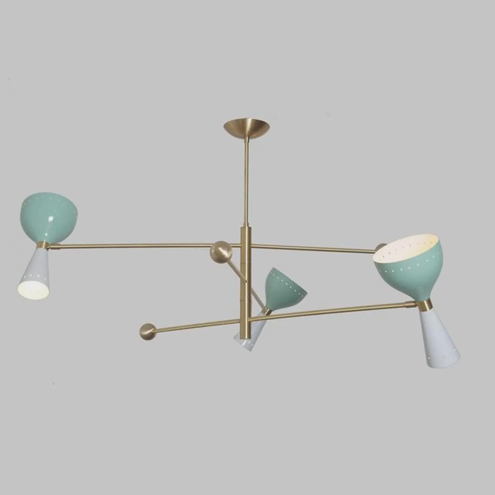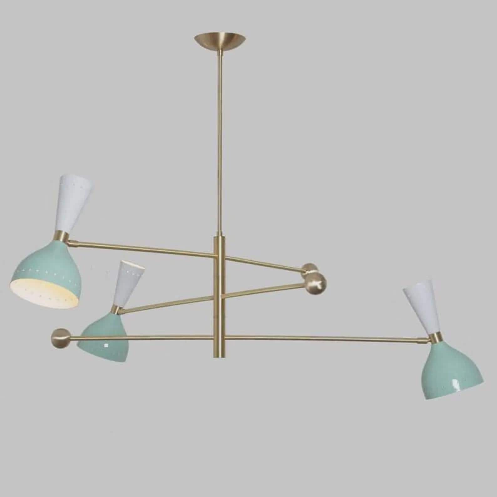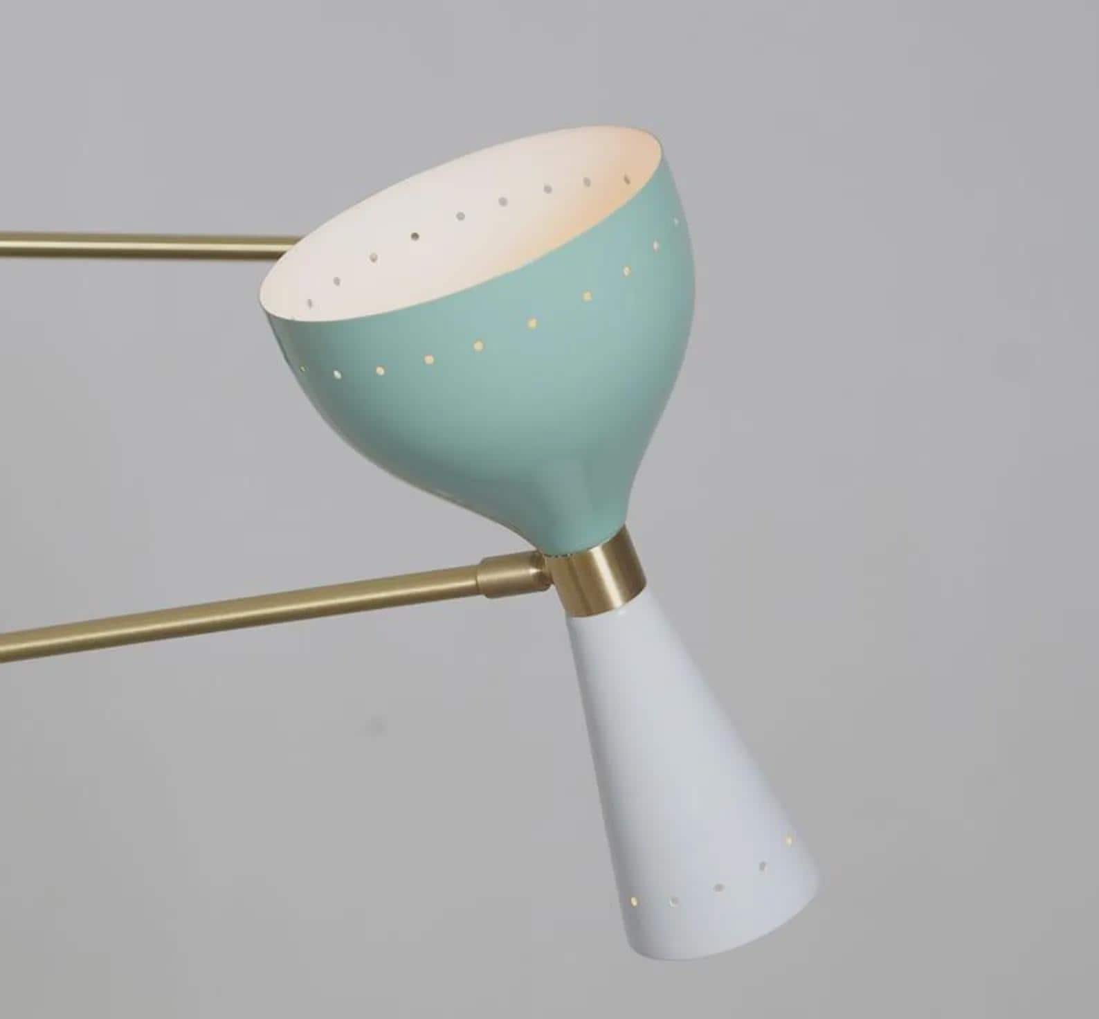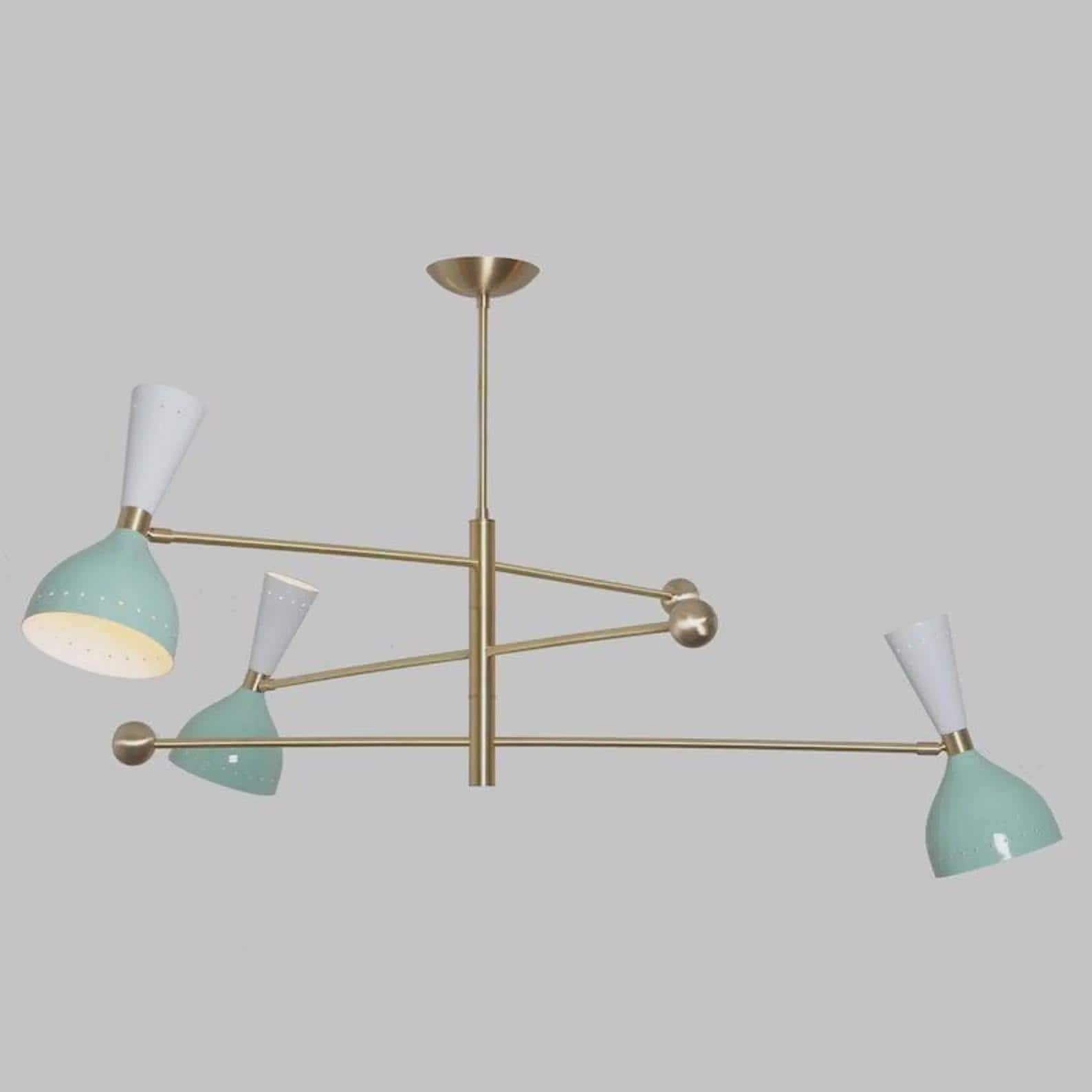 Three Shade Lights Stilnovo Style Cone Shade Sputnik Chandelier Light Fixture. chandelier features a brass piping with counter balanced arms and brass shades in classic modern shapes. each shade has both side sockets for light bulbs to spread the lights in all direction. brass frame is available in selection of brass finishes. size customization is also available so please contact us if you need any customization.