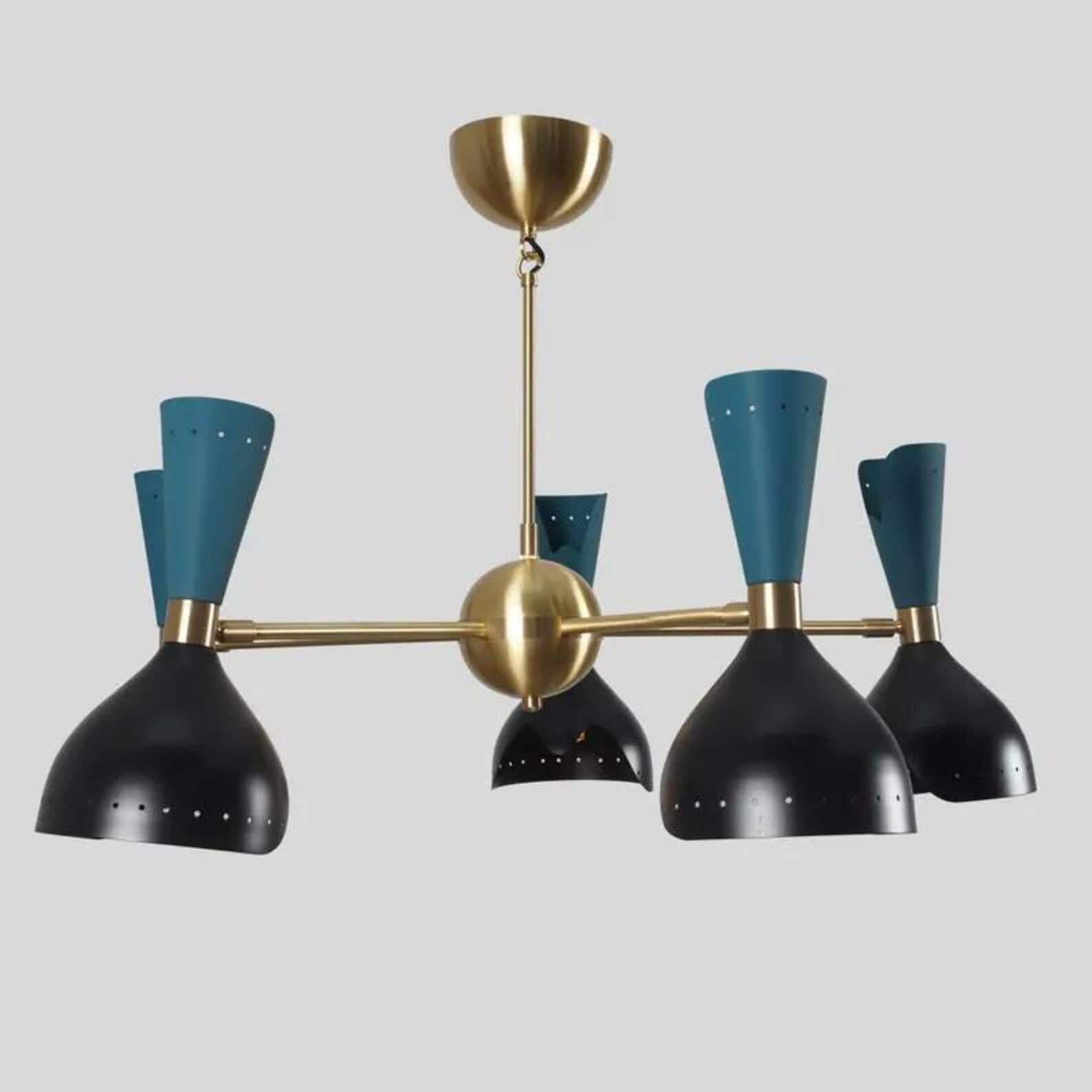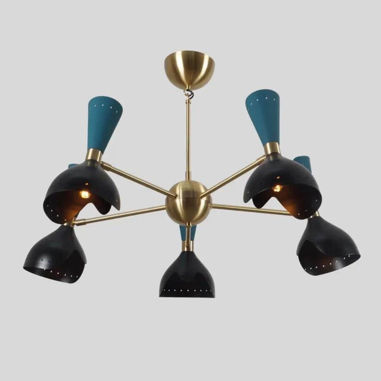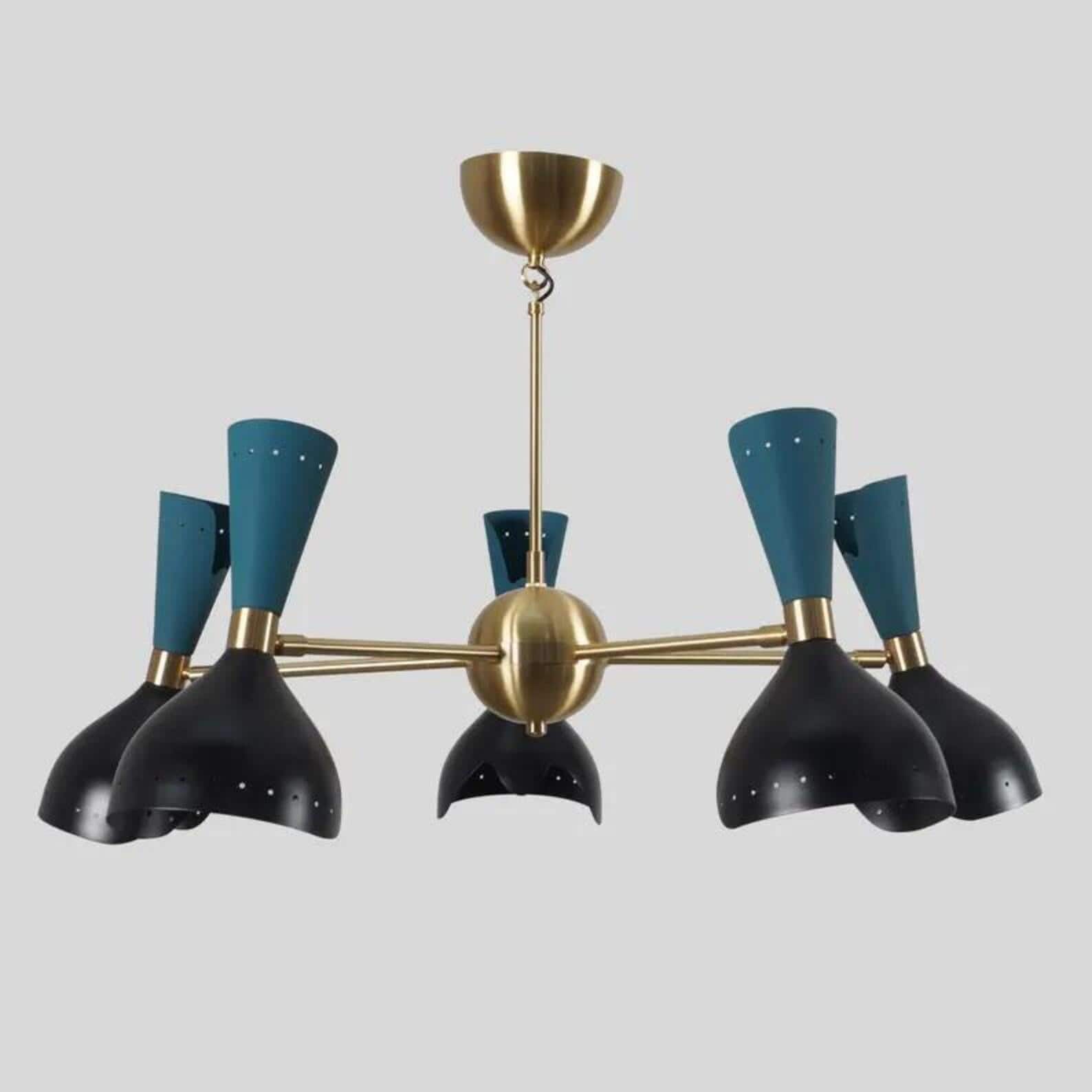 Mid-century Modern Stilnovo Style Diabolo Cut-out Shade Sputnik Chandelier, with 5 arms and 10 lights which provides a lot of light. Crafted from durable solid brass, this chandelier features a bold geometric design, making it a standout piece for any room. Perfect for dining rooms, foyers, or entryways, its vintage charm is enhanced by the vibrant finish, adding a touch of modern flair to boho, Scandinavian, or industrial interiors.