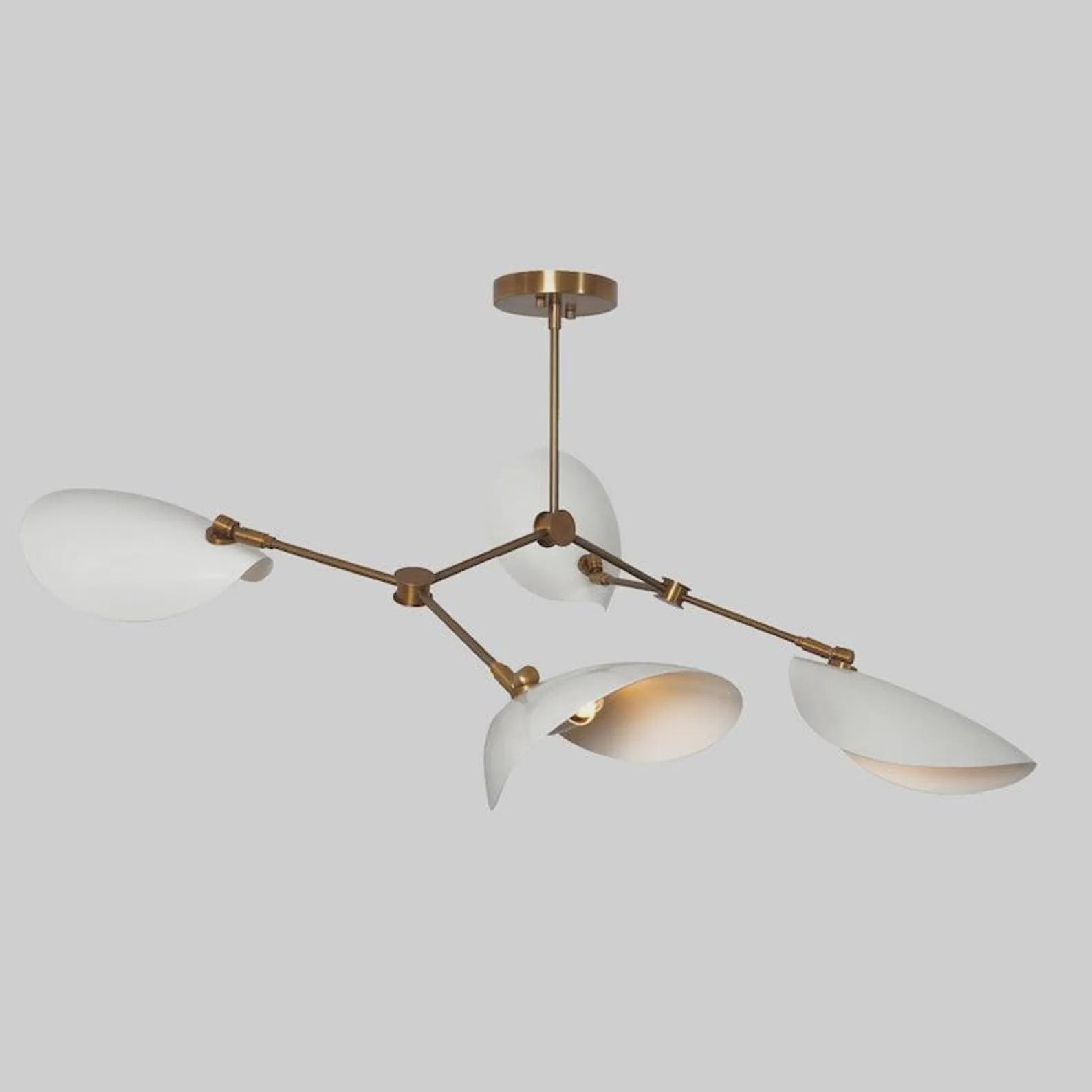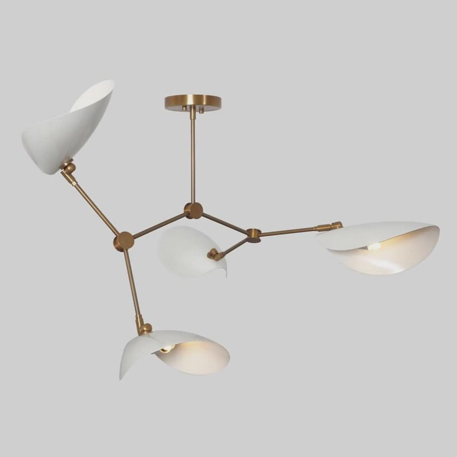 Four Lights Brass Sputnik Branch Chandelier features curved disk shades in off white color. As a Free Flowing Sculpture It takes in the space and insists on a life of its own. just like the floating movement of stingray fish which is the inspiration behind the design of the lampshades. brass frame is available in selection of brass finishes. size customization is also available so please contact us if you need any customization.