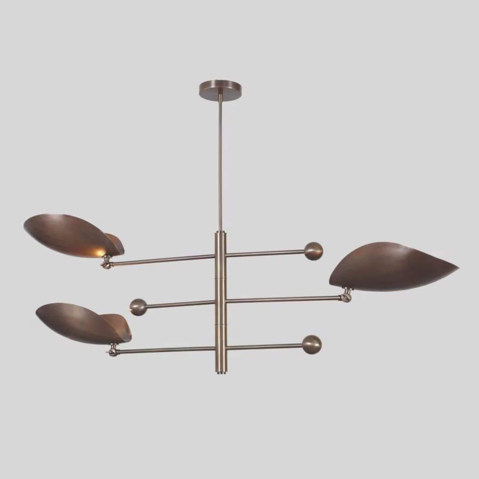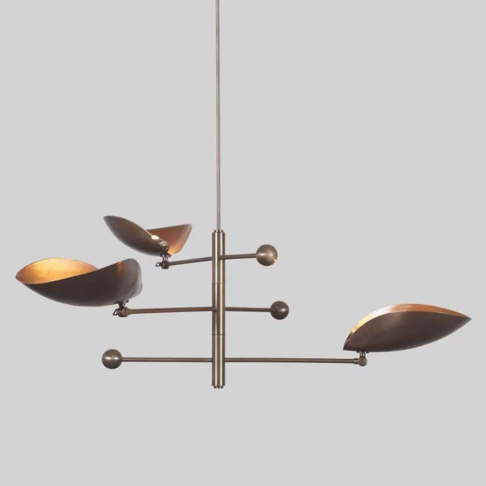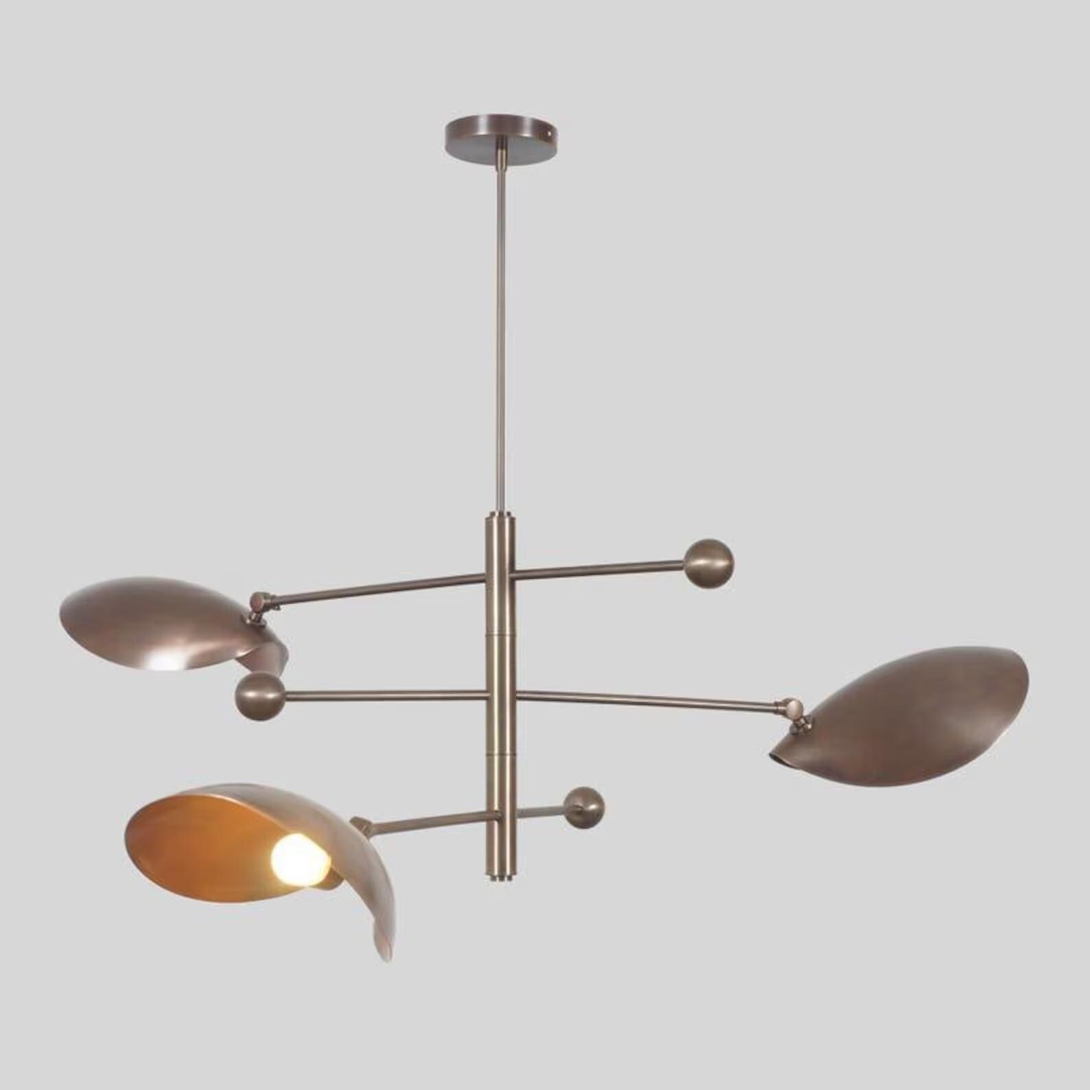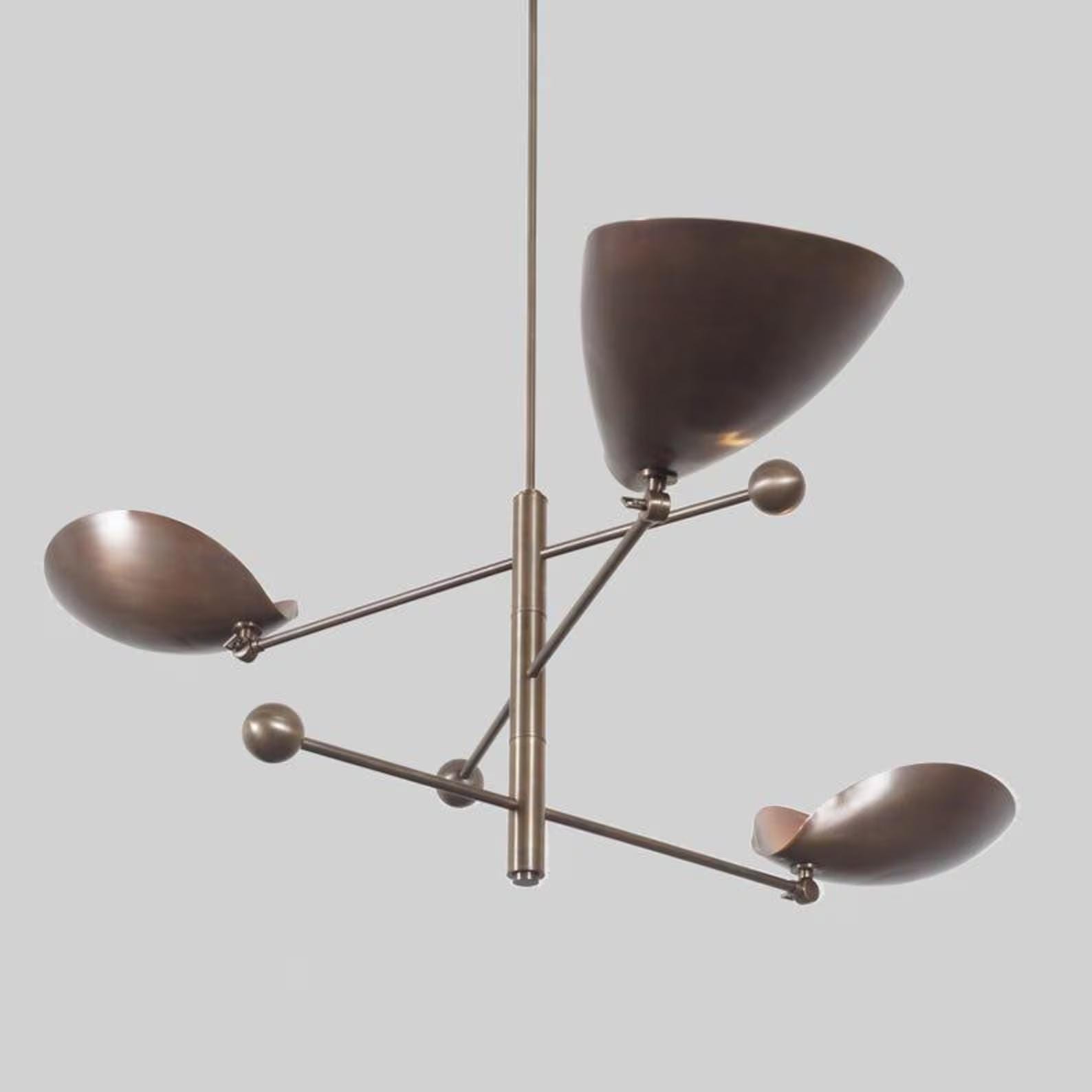 Three Arms Light Shade Lights Stilnovo Style Metal Cone Shade Sputnik Chandelier Light Fixture. chandelier features a brass piping with counter balanced arms and brass shades in classic modern shapes. brass frame is available in selection of brass finishes. size customization is also available so please contact us if you need any customization.
